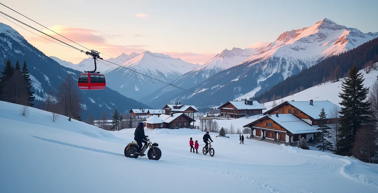 Le VTT électrique sur neige, ou « fat bike », n’est plus un simple gadget pour touristes en mal de sensations. Il s’impose de plus en plus comme une véritable alternative pour explorer la montagne différemment. Loin d’être une simple imitation du VTT estival, cette pratique offre une expérience unique de glisse et de découverte silencieuse des paysages enneigés, accessible même aux non-skieurs. Des stations comme Val d’Isère l’ont d’ailleurs officiellement intégré à leur offre touristique, proposant des sorties encadrées pour tous les niveaux. L’assistance électrique permet de s’affranchir des difficultés liées au dénivelé, rendant l’activité plus contemplative que purement sportive.